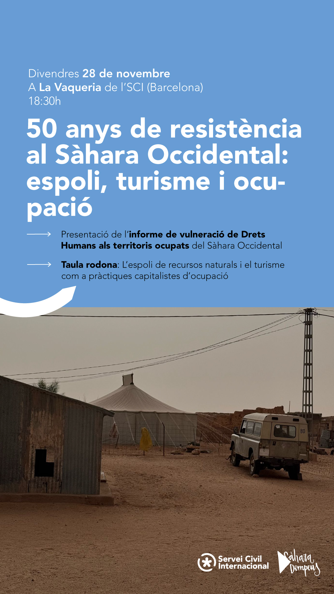 El divendres 28 de novembre a les 18:30, quan ja fa 50 anys de l’ocupació del territori, organitzem un acte amb Sàhara Dempeus i joves sahrauís de la diàspora per dialogar sobre l’espoli, el turisme i l’ocupació al Sàhara Occidental.