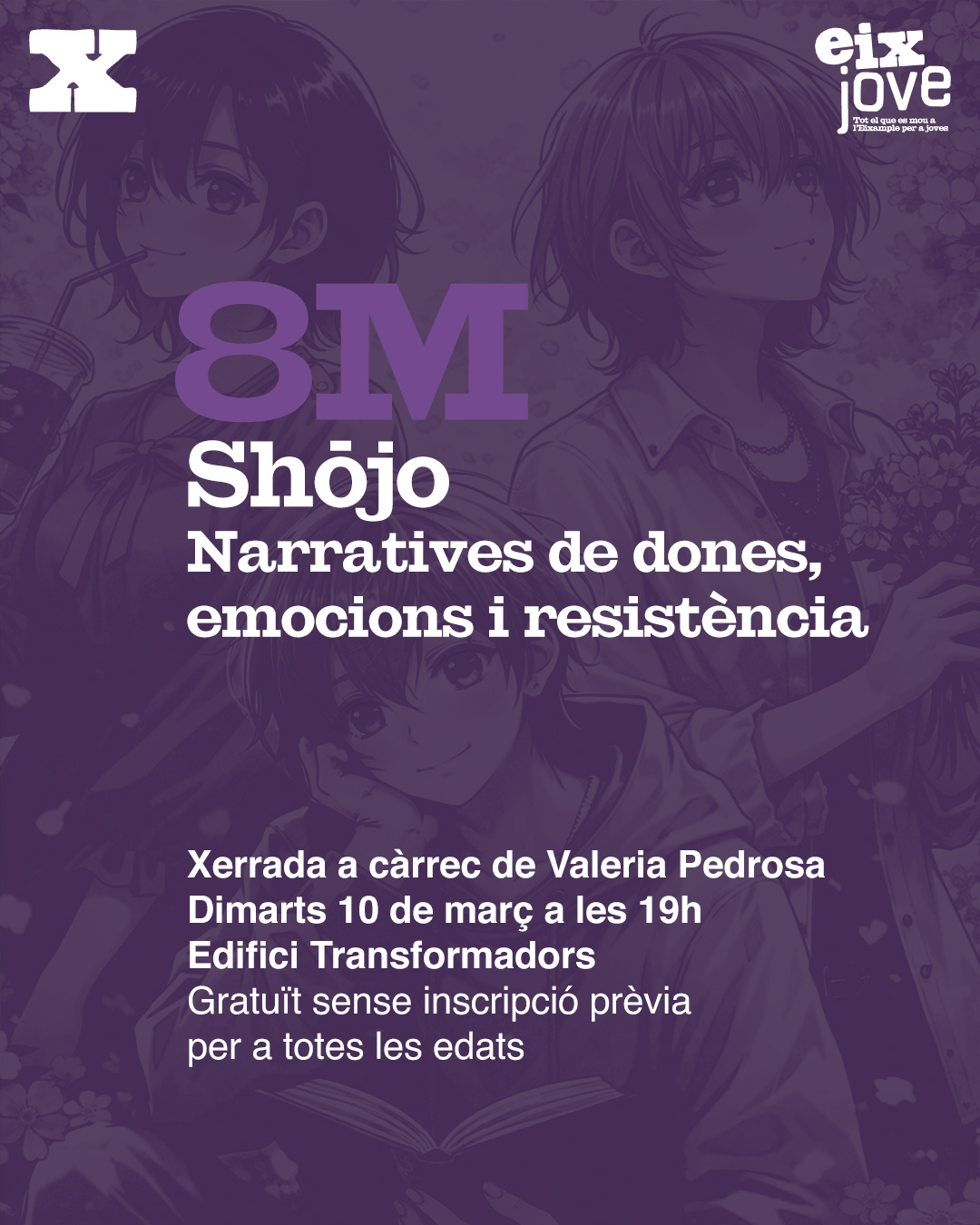 Programació especial de l’Eix Jove amb motiu del 8M Dia Internacional de les Dones Treballadores. El Shōjo es tracta d'un gènere del Manga i l’Anime habitualment infravalorat per ser dirigit a un públic femení. En aquesta xerrada ens endinsarem en la història del Shōjo, analitzant les seves principals autores i els principals còmics i animacions. Dimarts 10 de març a les 19h a l’Edifici Transformadors. Per a totes les edats.