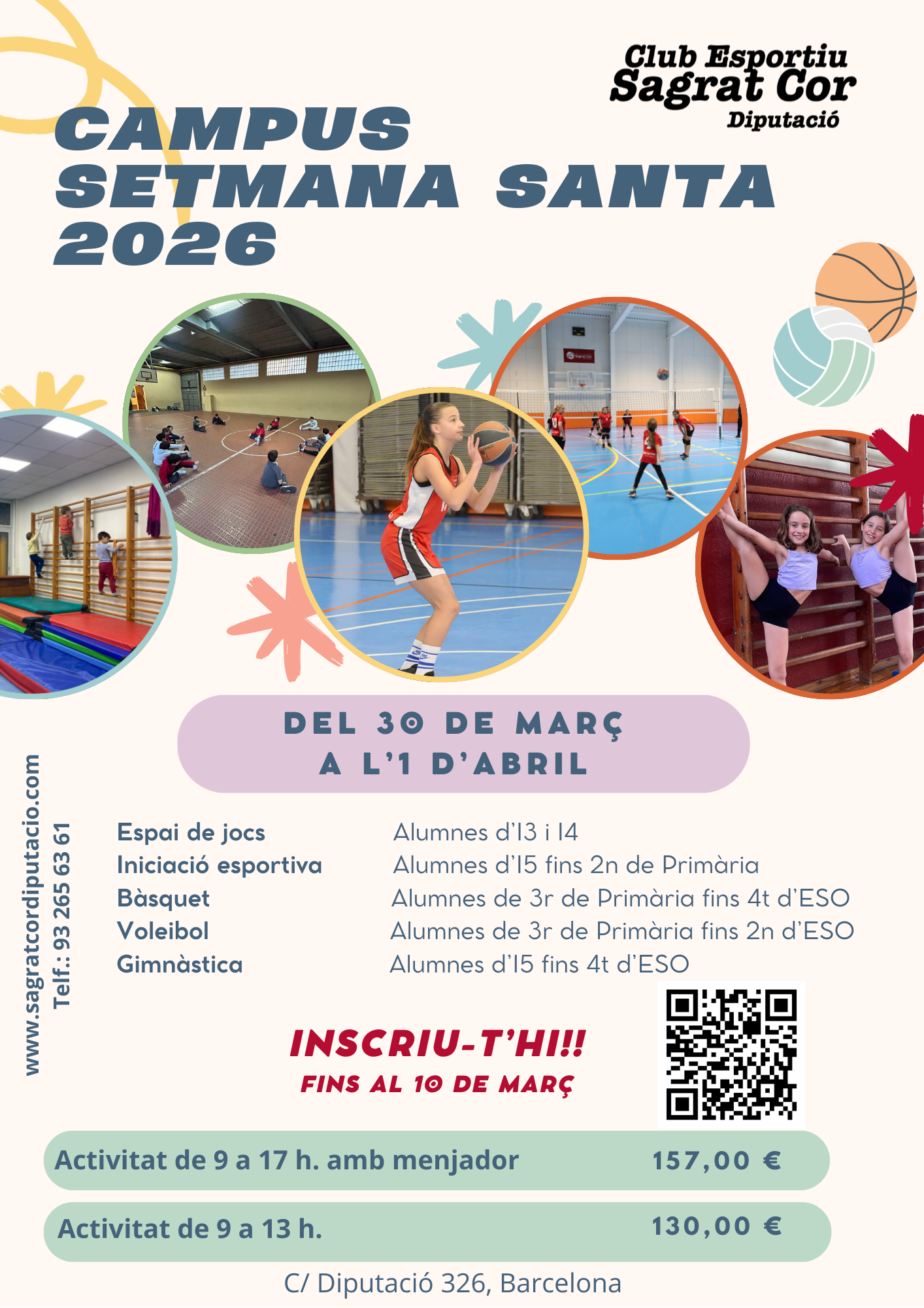 Data inici * dl., 30/03/2026 - 09:00 Districte i barri * Eixample Campus Setmana Santa 2026 Organitza Club Esportiu Sagrat Cor Diputació Campus esportiu Setmana Santa 2026 Campus esportiu amb activitats de bàsquet, voleibol, gimnàstica i iniciació a l'esport per als més petits.