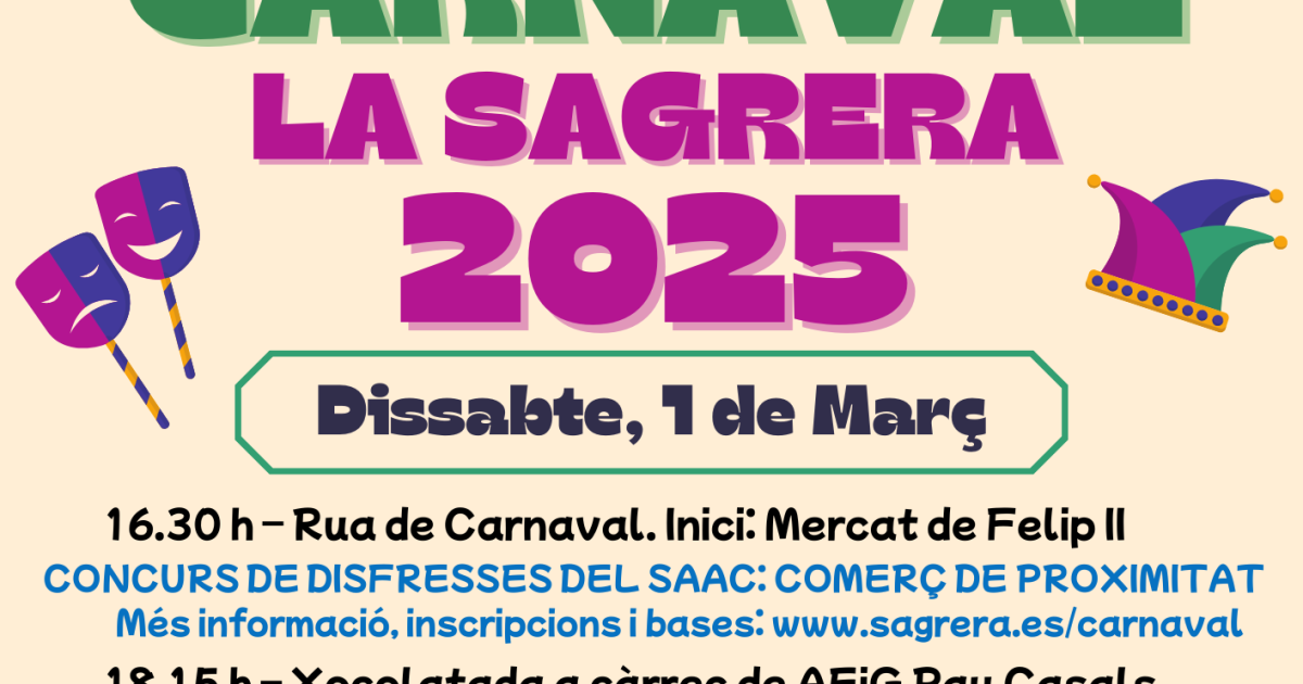 Torna el Carnaval a la Sagrera el dissabte dia 1 de març de 2025, amb la rua pels carrers del barri, l'espectacle d'animació i la xocolatada!