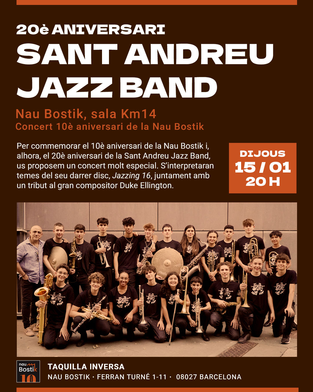 Aquest concert tanca un cicle molt especial per a la Nau Bostik, en què hem celebrat deu anys d’un projecte col·lectiu nascut de l’esforç, la il·lusió i la implicació veïnal, coincidint també amb els vint anys de la Sant Andreu Jazz Band. En un context de creixent gentrificació que tensiona barris com la Sagrera, la Nau Bostik ha resistit com un espai arrencat a l’especulació i construït des de la lluita col·lectiva.