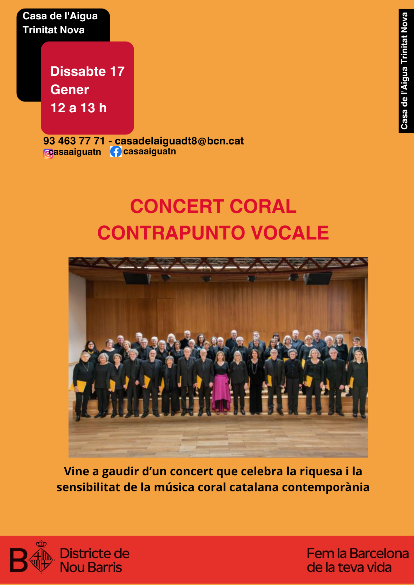 Data inici * ds., 17/01/2026 - 12:00 Districte i barri * Nou Barris Concert de la Coral Contrapunto Vocale Organitza Casa de l'Aigua de la Trinitat Nova Música coral catalana contemporània Música coral contemporània