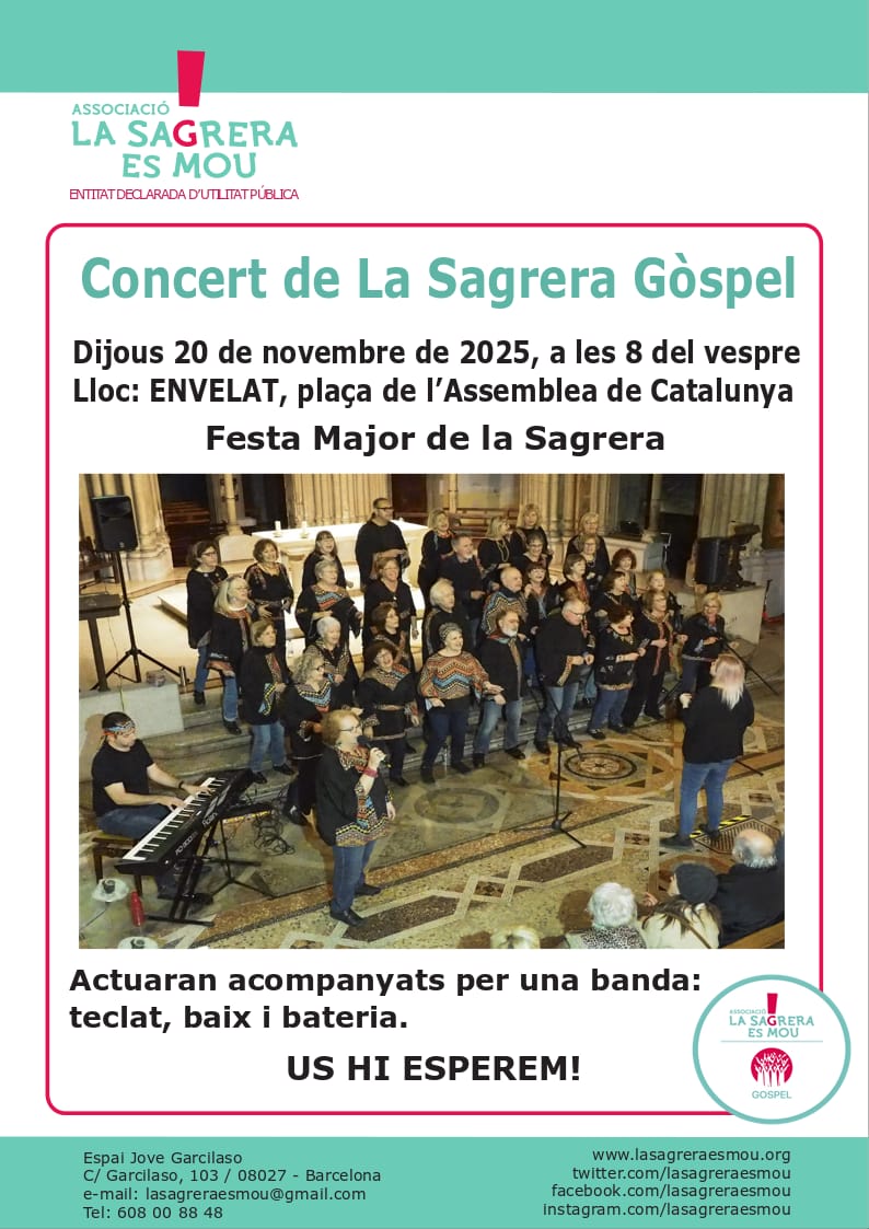 Data inici * dj., 20/11/2025 - 20:00 Districte * Sant Andreu Concert de La Sagrera Gòspel Organitza Associació La Sagrera Es Mou En col·laboració amb Comissió de festes de la Sagrera Actuaran acompanyats per una banda: teclat, baix i bateria Acte inclós dins del programa de la Festa Major de la Sagrera