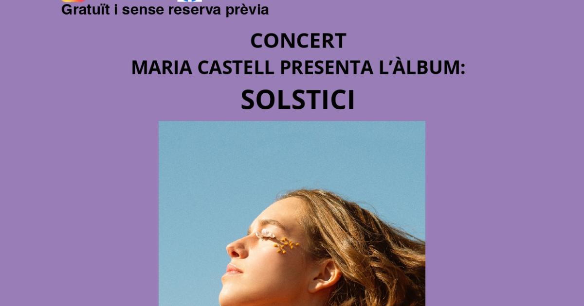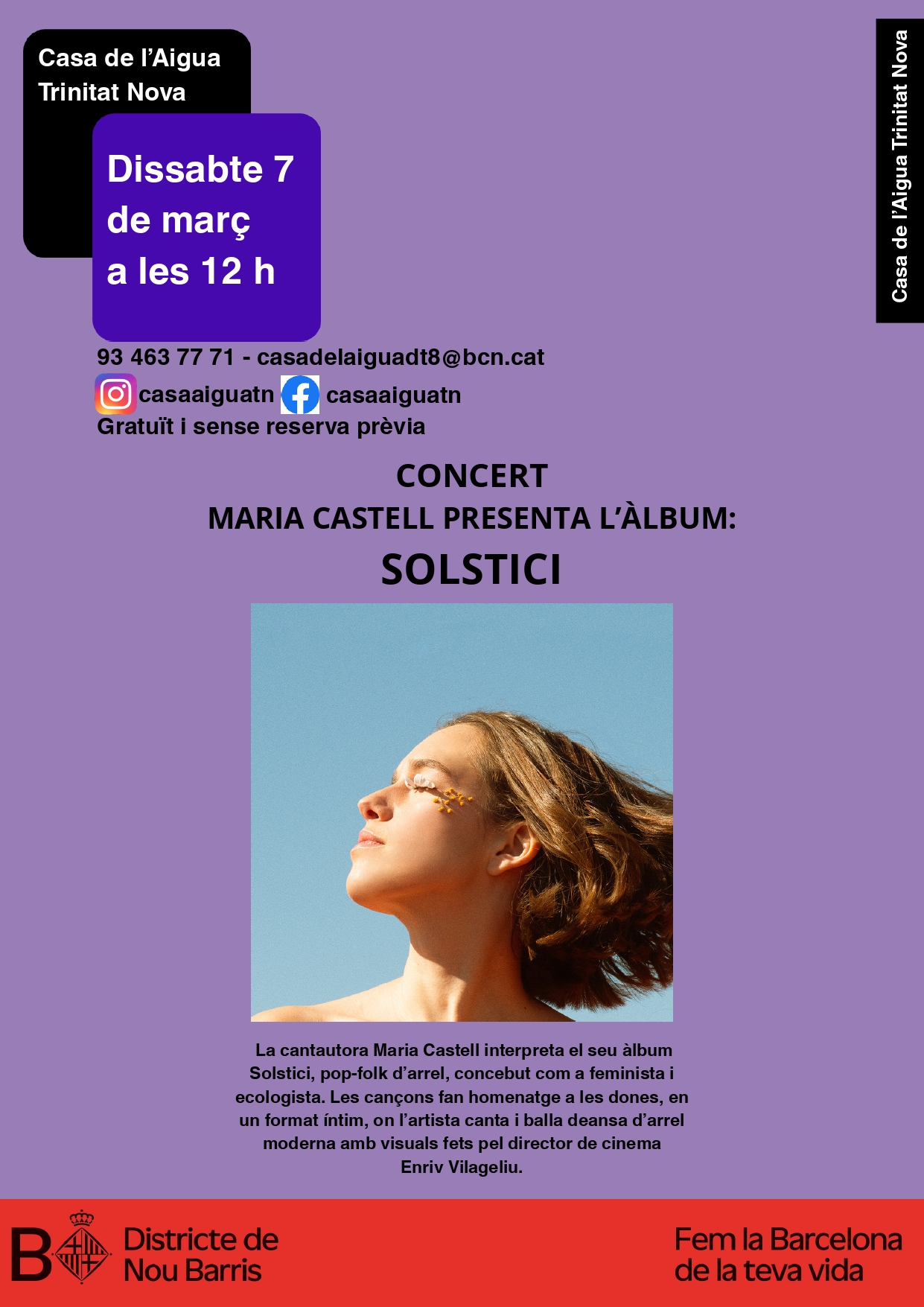 Data inici * ds., 07/03/2026 - 12:00 Districte i barri * Nou Barris Concert de Maria Castell Organitza Casa de l'Aigua de la Trinitat Nova Cantautora catalana Maria Castell ens presenta el seu nou àlbum "Solstici" Maria Castell en concert
