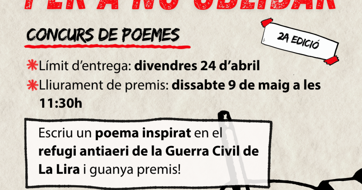 Si t’apassiona la poesia i vols contribuir a recordar el nostre passat, presenta el teu poema (inèdit i original) inspirat en el refugi antiaeri de la Guerra Civil de La Lira. El concurs està obert a persones a partir de 16 anys, i els versos es poden enviar fins al 24 d’abril de 2026.