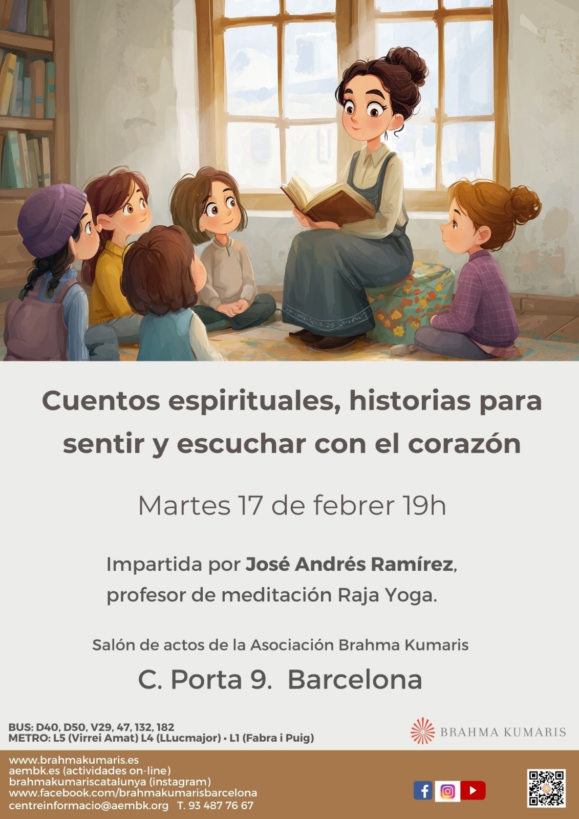 Data inici * dt., 17/02/2026 - 19:00 Districte i barri * Nou Barris Conferència: Contes espirituals, històries per sentir i escoltar amb el cor Organitza Associació Brahma Kumaris Contes i històries per reflexionar Reflexió i meditació.