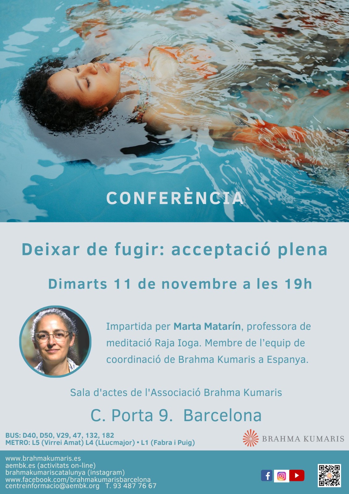 Data inici * dt., 11/11/2025 - 19:00 Districte * Nou Barris Conferència: Deixar de fugir: acceptació plena Organitza Associació Brahma Kumaris Descobrir els recursos interns per viure-hi plenament. Reflexions i experiència a través de la meditació Raja Ioga