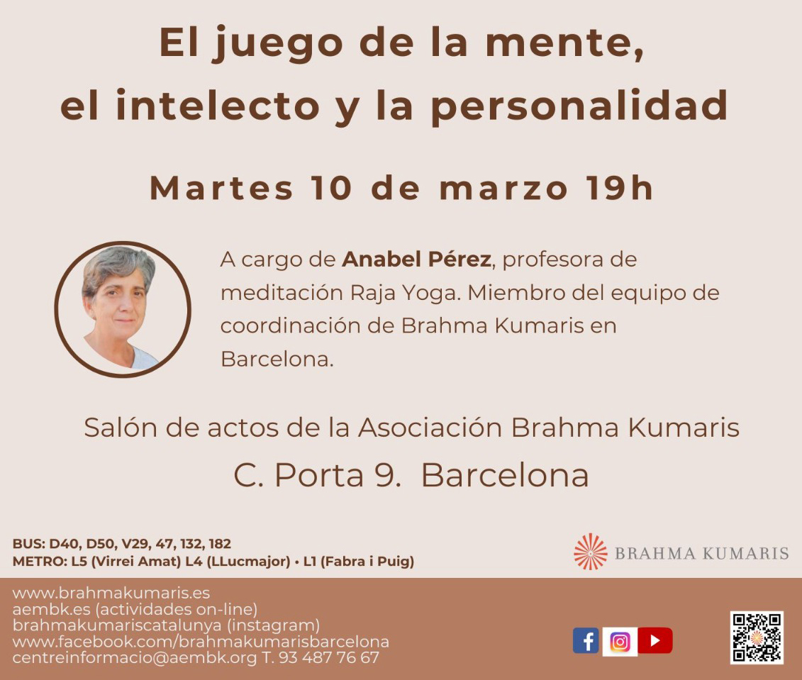 Data inici * dt., 10/03/2026 - 19:00 Districte i barri * Nou Barris Conferència: El joc de la ment, l'intel·lecte i la personalitat Organitza Associació Brahma Kumaris Conéixer les nostres facultats subtils. Reflexió i meditació.