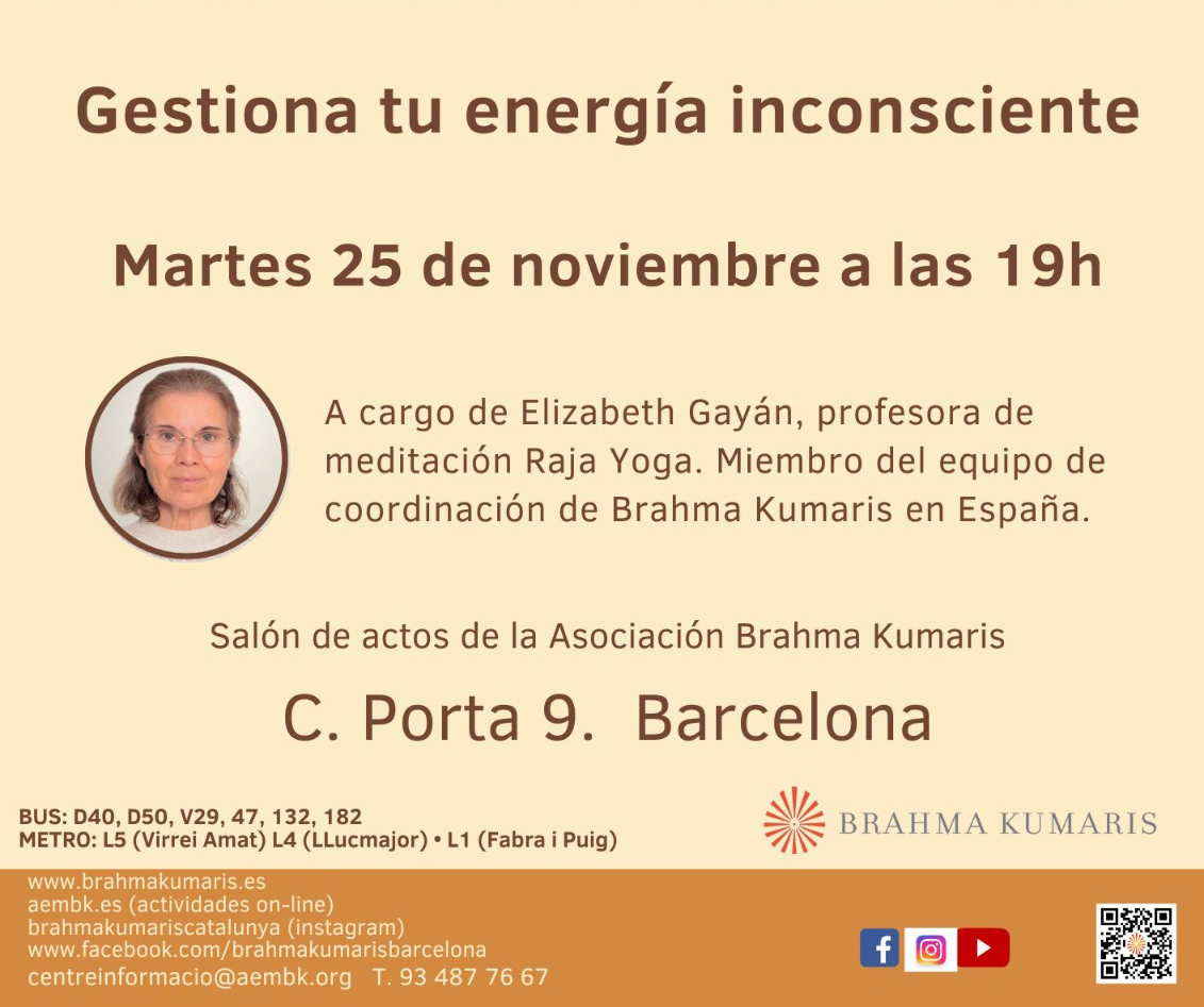 Data inici * dt., 25/11/2025 - 19:00 Districte * Nou Barris Conferència: Gestiona la teva energia inconscient Organitza Associació Brahma Kumaris Descobrir els recursos interns per viure-hi plenament. Reflexions i experiència a través de la meditació Raja Ioga