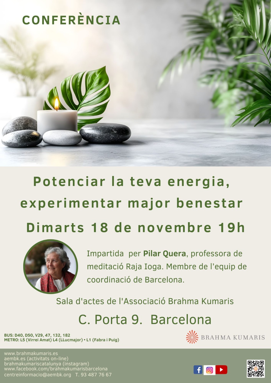 Data inici * dt., 18/11/2025 - 19:00 Districte * Nou Barris Conferència: Potenciar la teva energia, experimentar major benestar Organitza Associació Brahma Kumaris Descobrir el que ens enforteix. Reflexió i meditació.
