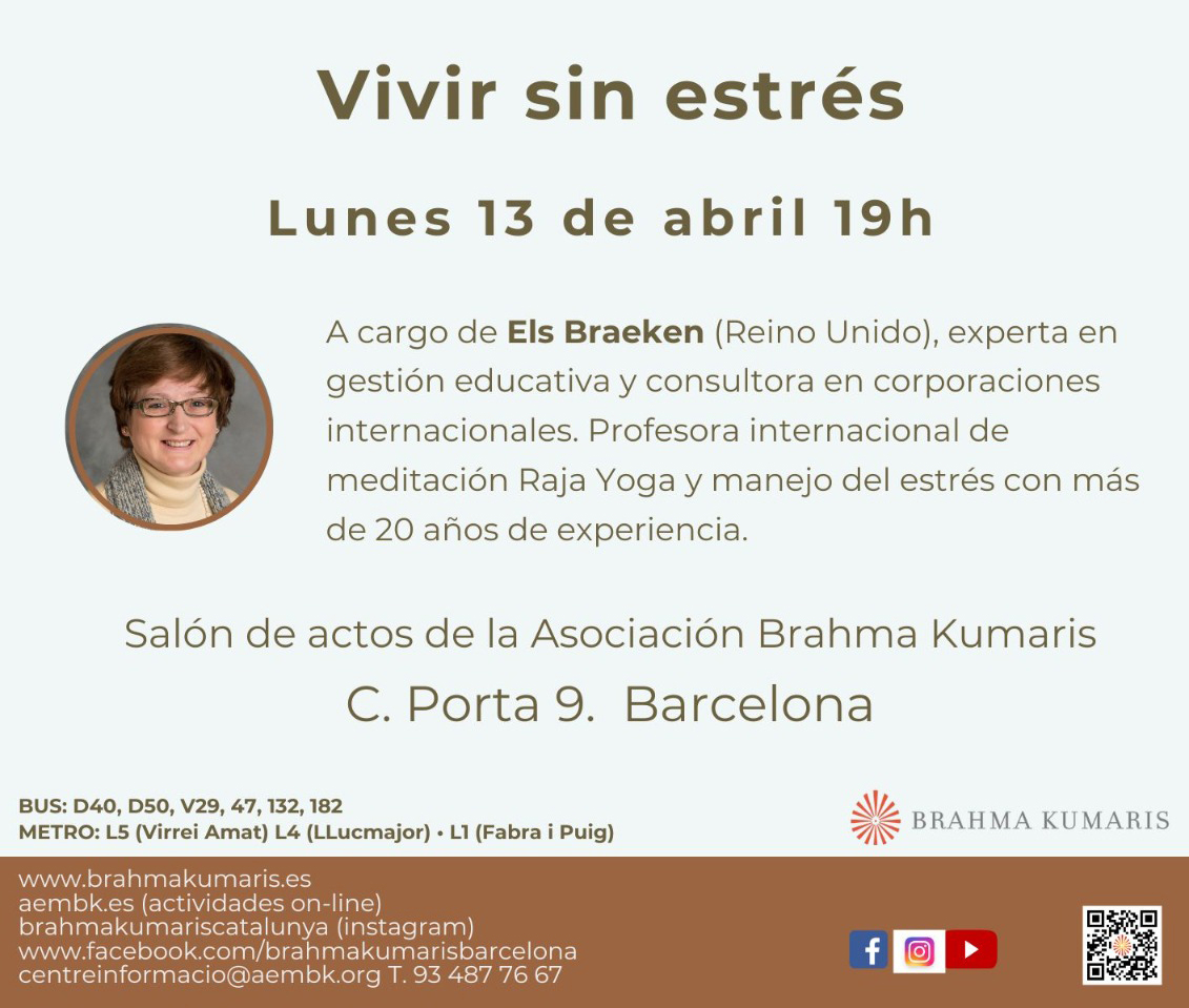 Data inici * dl., 13/04/2026 - 19:00 Districte i barri * Nou Barris Conferència: Viure sense estrès Organitza Associació Brahma Kumaris Conéixer els nostres recursos interns. Reflexió i meditació.