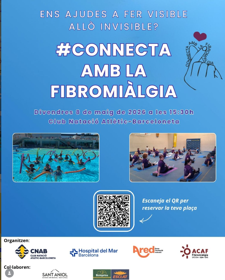 Data inici * dv., 08/05/2026 - 15:30 Districte i barri * Ciutat Vella Connecta amb la fibromiàlgia Organitza ACAF - Associació Catalana d'Afectades i Afectats de Fibromiàlgia i d'altres Síndromes de Sensibilització Central Jornada saludable, amb motiu del Dia Mundial de la Fibromiàlgia Activitat a piscina i activitat de ioga suau a les instal.lacions del CNAB