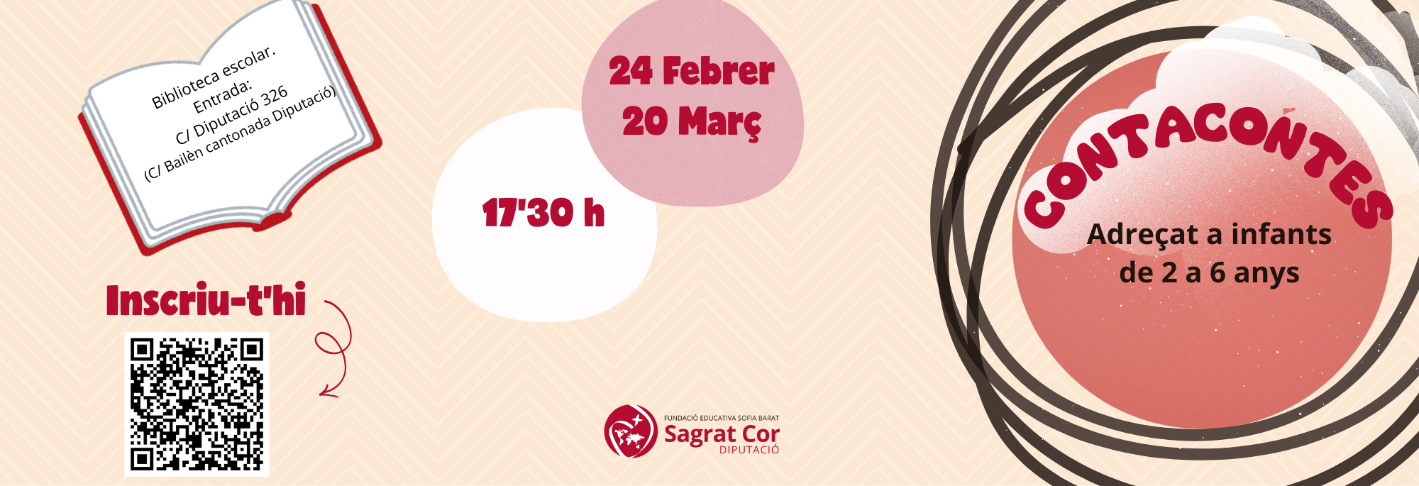 Data inici * dt., 24/02/2026 - 17:30 Districte i barri * Eixample Conta Contes 2026 Organitza FESB Sagrat Cor Diputació Conta contes a l'escola per als més petits Conta contes a la biblioteca de l'escola adreçat a alumnes de 2 a 6 anys.