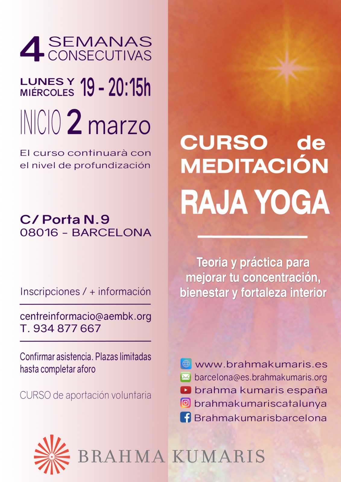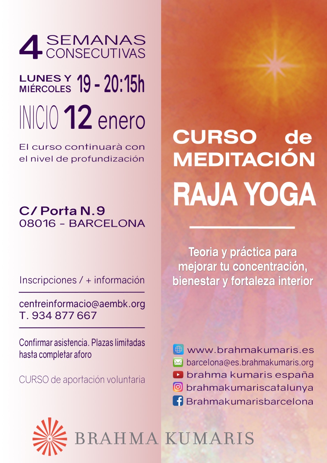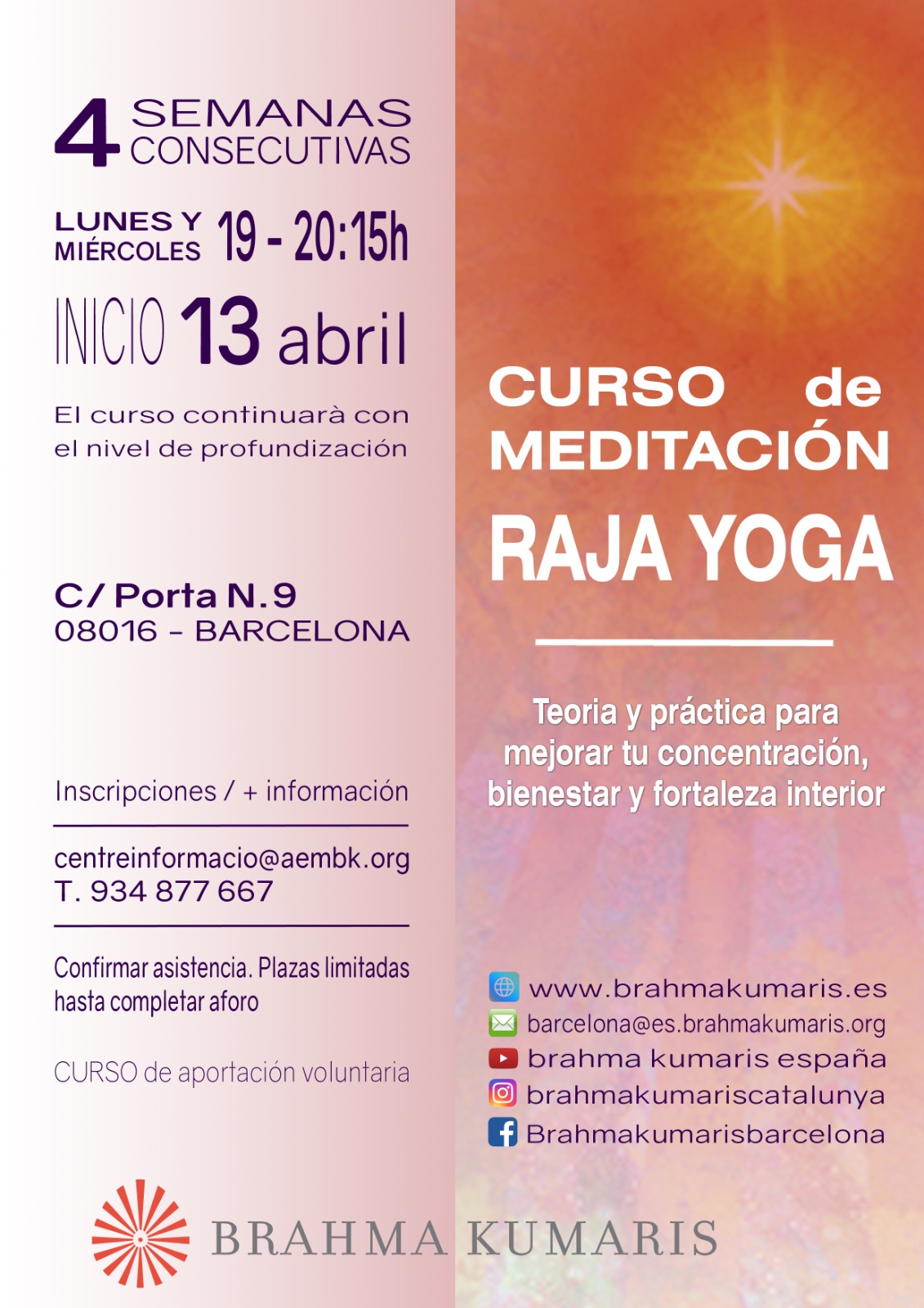 Curs per aprofundir en el coneixement i la pràctica de la Meditació Raja Yoga. La pràctica de la meditació ens pot ajudar a trobar un espai interior on calmar-nos i recuperar la nostra fortalesa.