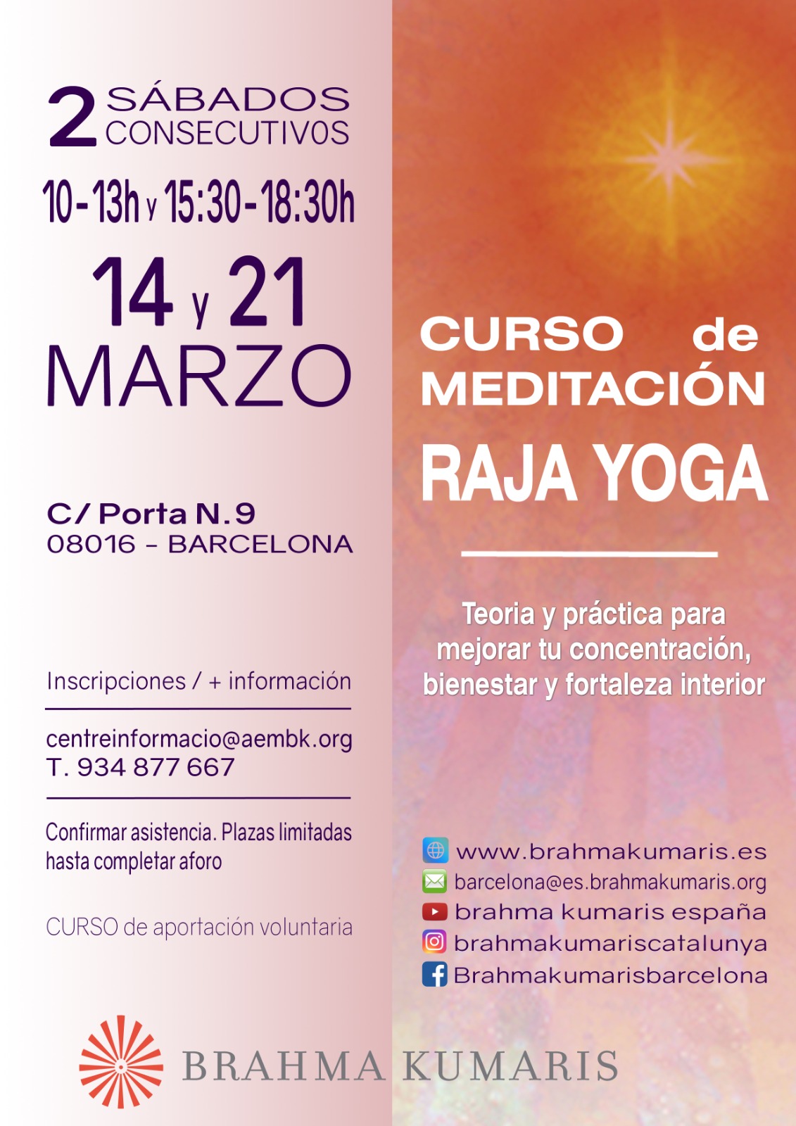 Data inici * ds., 14/03/2026 - 10:00 Districte i barri * Nou Barris Curs Essencial de Meditació Raja Ioga Organitza Associació Brahma Kumaris Curs per aprofundir en el coneixement i la pràctica de la Meditació Raja Ioga. La pràctica de la meditació ens pot ajudar a trobar un espai interior on calmar-nos i recuperar la nostra fortalesa.