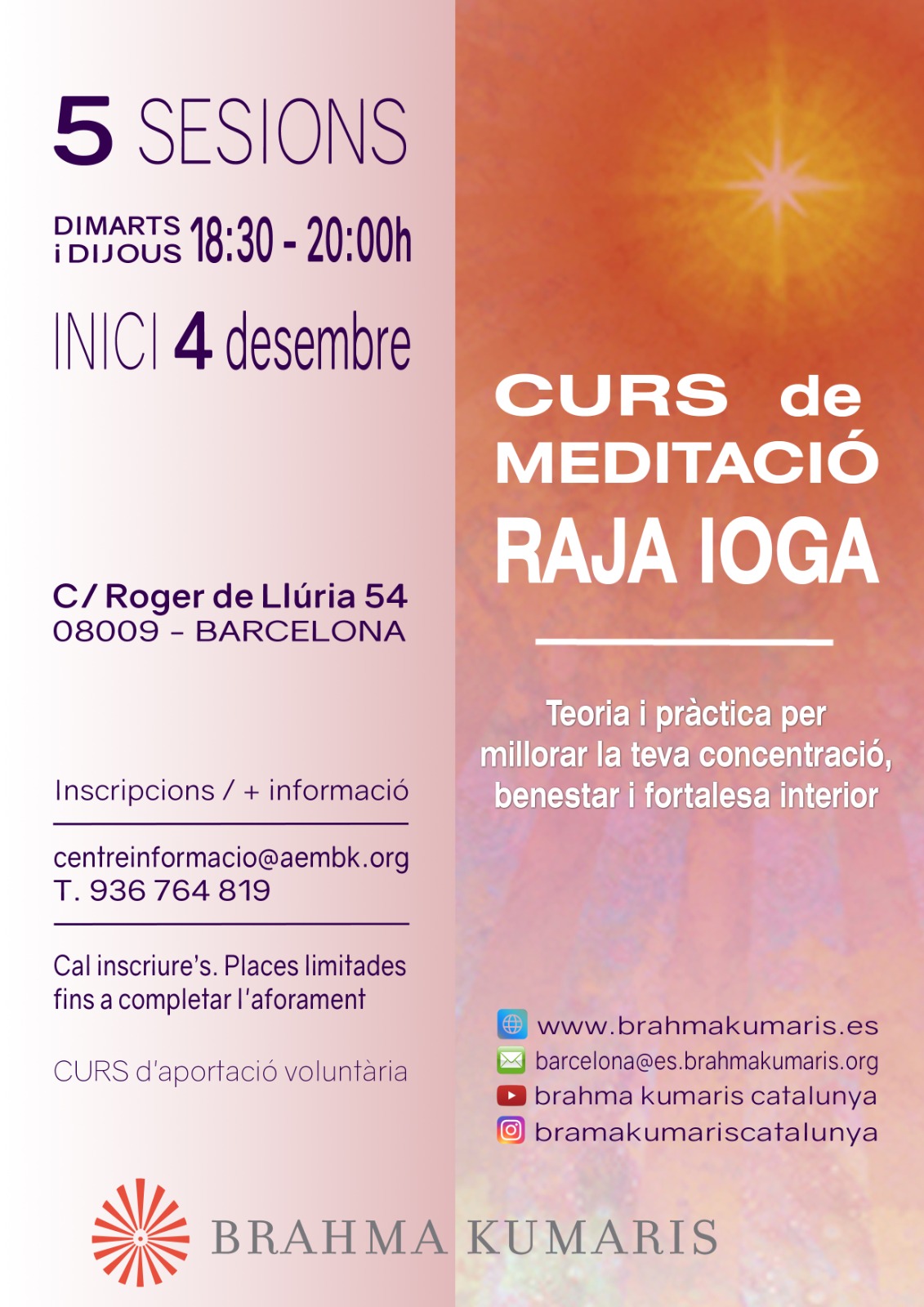 Data inici * dj., 04/12/2025 - 18:30 Districte * Eixample Curs Essencial de Meditació Raja Ioga Organitza Associació Brahma Kumaris Curs per aprofundir en el coneixement i la pràctica de la Meditació Raja Yoga. La pràctica de la meditació ens pot ajudar a trobar un espai interior on calmar-nos i recuperar la nostra fortalesa.