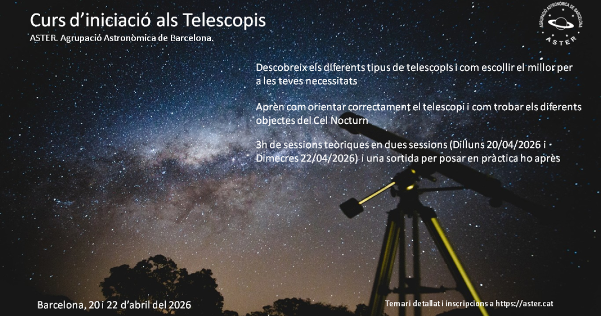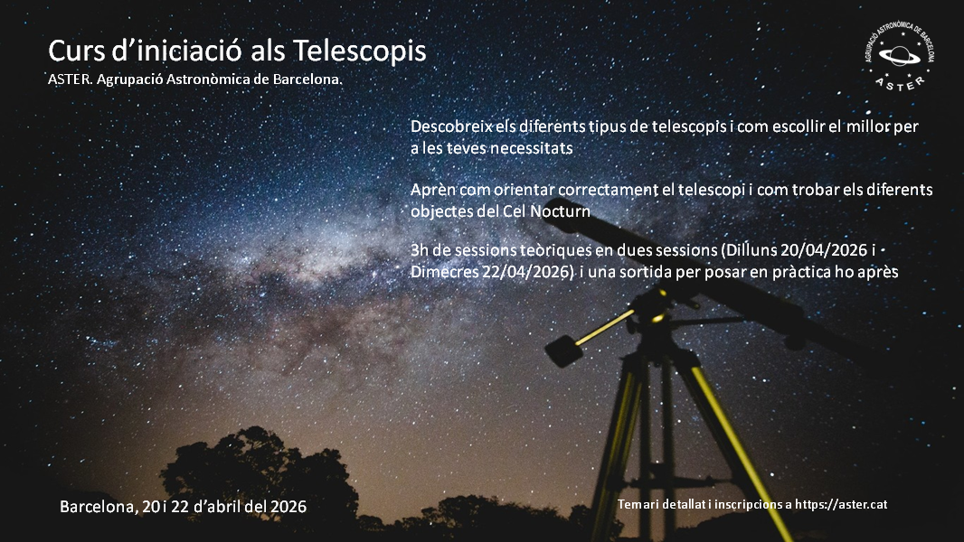 El 20 i 22 d'abril, ASTER, Agrupació Astronòmica de Barcelona, organitza el Curs Posem en marxa el telescopi