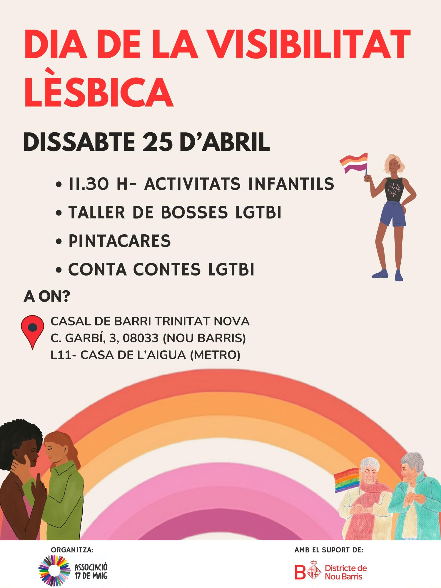 Data inici * ds., 25/04/2026 - 11:30 Districte i barri * Nou BarrisLa Trinitat Nova DIA DE LA VISIBILITAT LÈSBICA Organitza Associació 17 de Maig Activitat pel dia de la visibilitat lèsbica 11.30 h- Activitats infantilsTaller de bosses LGTBIPintacaresConta contes LGTBI