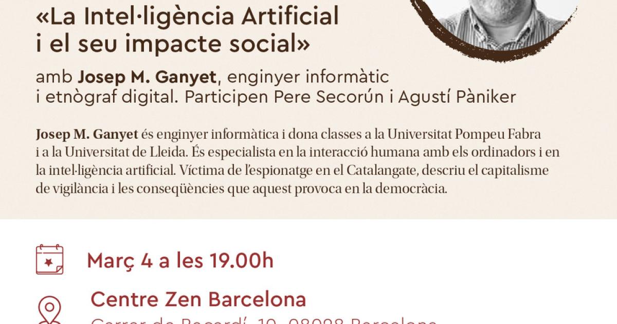 El dilluns 4 de març a les 19h, dialogarem amb Josep M. Ganyet sobre "La Intel·ligència Artificial i el seu impacte social" al Centre Zen de Barcelona dins l'espai interdisciplinari de diàleg obert en col·laboració amb Editorial Kairós, "Els dilluns de la lluna nova", que posa en contacte el budisme zen amb els diferents aspectes de la vida quotidiana.