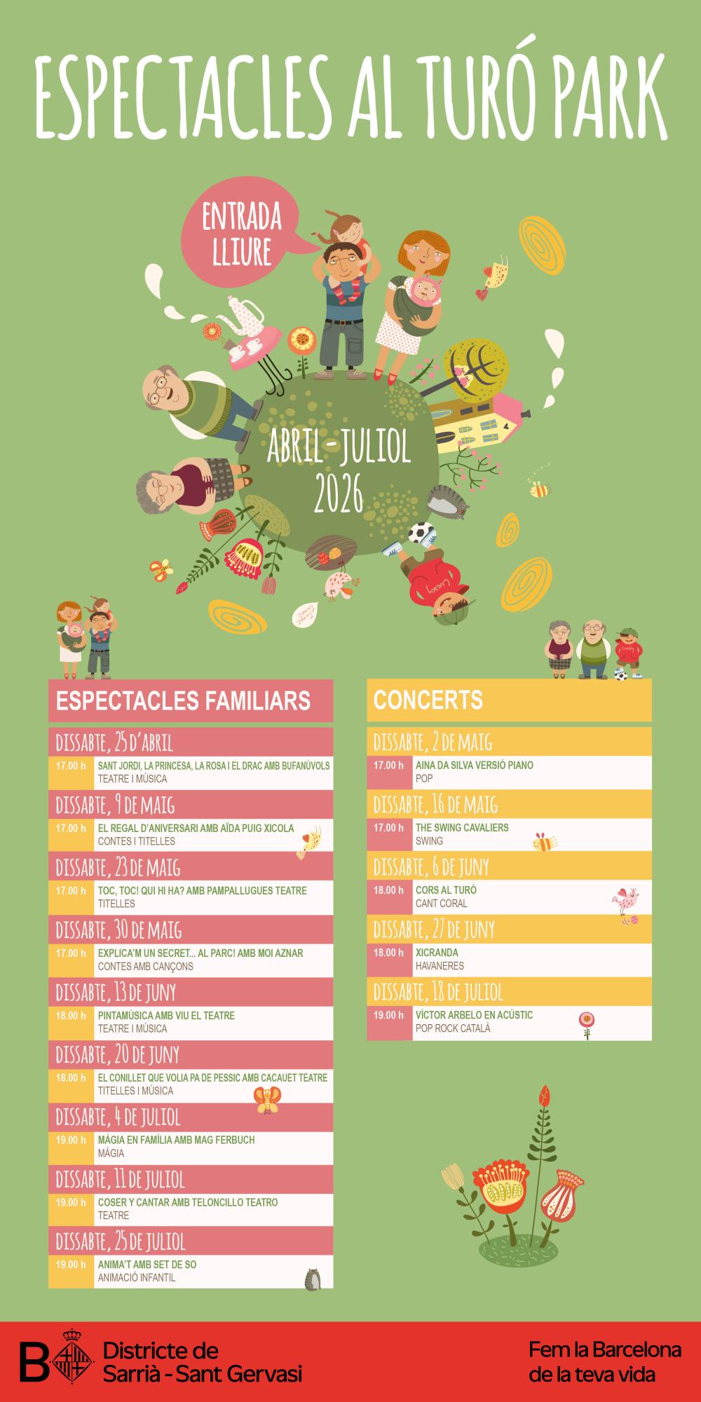 Data inici * ds., 09/05/2026 - 17:00 Districte i barri * Sarrià-Sant Gervasi El regal d'aniversari al Turó Park Organitza Viu el Teatre En col·laboració amb Viu el Teatre Un espectacle d'Aïda Puig A l'aire lliure i amb entrada gratuïta.S’obrirà l’espai trenta minuts abans de l’actuació