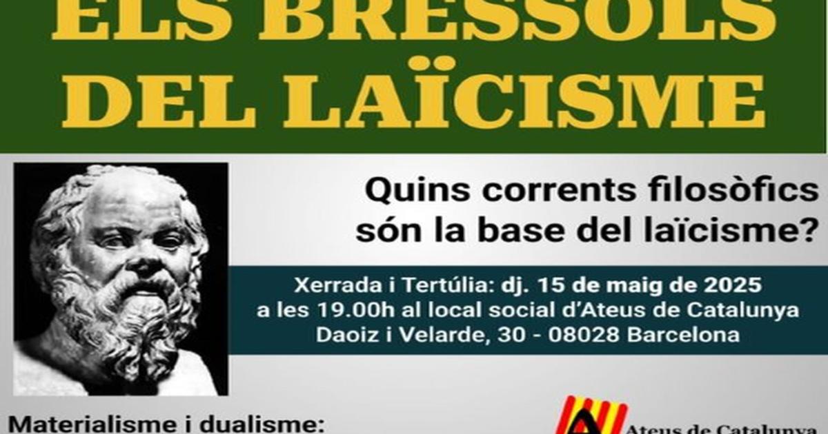 Data inici * dj., 15/05/2025 - 19:00 Districte i barri * Sants-Montjuïc Els Bressols del laïcisme Organitza Ateus de Catalunya Materialisme i dualisme: es poden debatre? Us hi esperem! Xerrada i Tertúlia al local social d'Ateus de Catalunya dijous 15 de maig de 2025 a les 19 h.