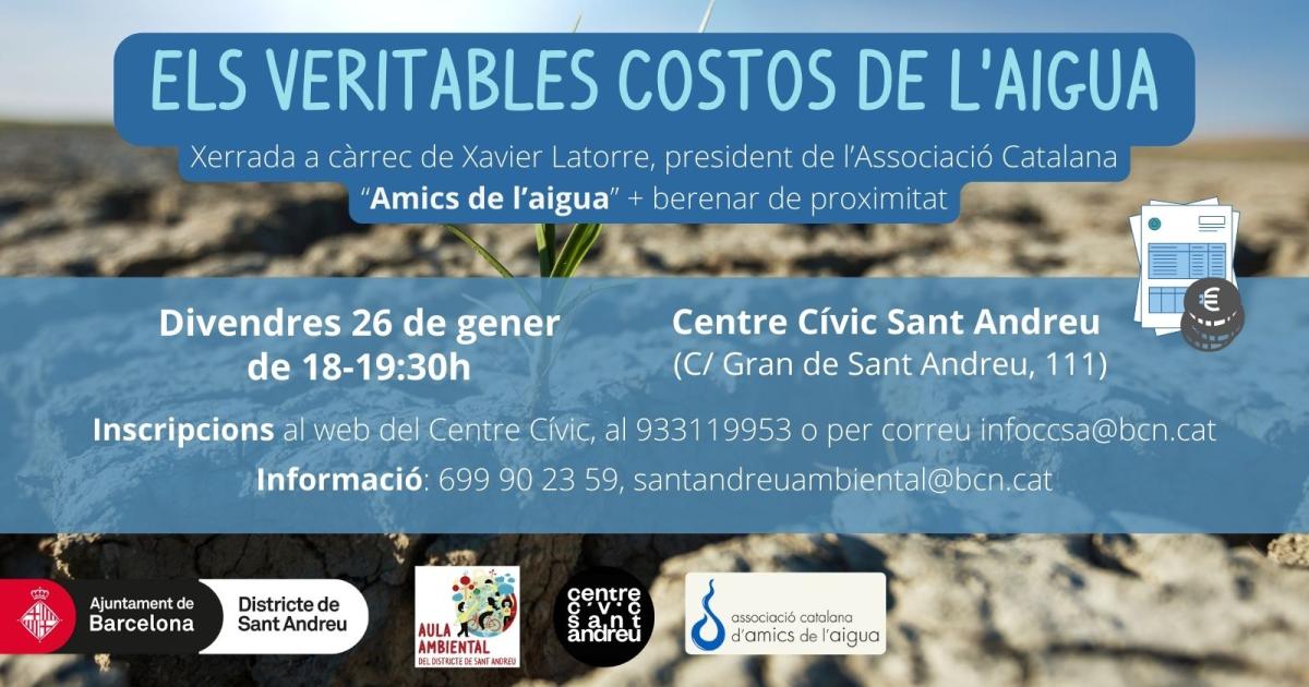 Ens trobarem totes al Centre Cívic de Sant Andreu, on Xavier Latorre, president de l’Associació Catalana “Amics de l’aigua”, ens posarà al dia dels diferents conceptes que engloben l’aigua a les nostres llars. Esbrinarem com hi arriba, què paguem en els subministraments domiciliaris, quines obligacions venen imposades des d’Europa i quines són les conseqüències del canvi climàtic (fonamentalment la sequera).