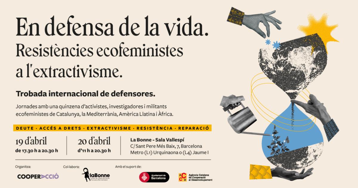 El 19 i 20 d’abril us convidem a la trobada internacional de defensores: En defensa de la vida: resistències ecofeministes a l’extractivisme que celebrarem a la Sala Vallespí de La Bonne (C/ de Sant Pere Més Baix, 7, Barcelona). Serà un espai d’intercanvi i aliances entre moviments feministes d’arreu i una oportunitat per a conèixer i compartir processos de lluita i resistència feminista vers els processos d’extractivisme i expulsió dels territoris del nord i del sud global, amb especial interès pel paper de les dones i identitats dissidents en la defensa dels seus drets i dels ecosistemes i territoris que co-habiten.
