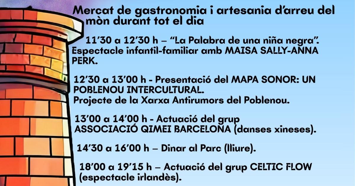 Durant tot el dia hi haurà paradetes d’artesania i gastronomia internacional, amb taules i cadires per dinar, i el Mapa sonor d’un Poblenou intercultural, a càrrec de la Xarxa Antirumors del Poblenou.