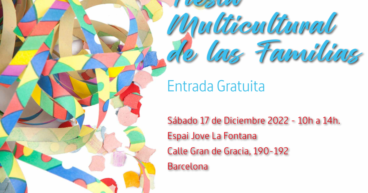 L'Associació Salut i Família organitza la festa multicultural de les famílies, que aquest any serà a l'Espai Jove La Fontana (C/ Gran de Gràcia 190-192) on les famílies podran passar un bon matí de dissabte de 10h a 14h. És una trobada festiva amb l'objectiu de demostrar la pràctica dels valors que impulsa l'Associació, la de la multiculturalitat, la del respecte i la de reforç dues de les xarxes socials més importants, la de la família i la del veïnatge. Serà el proper dissabte, 17 de desembre. Volem celebrar i gaudir plegats aquest dia amb activitats per a adults i nens
