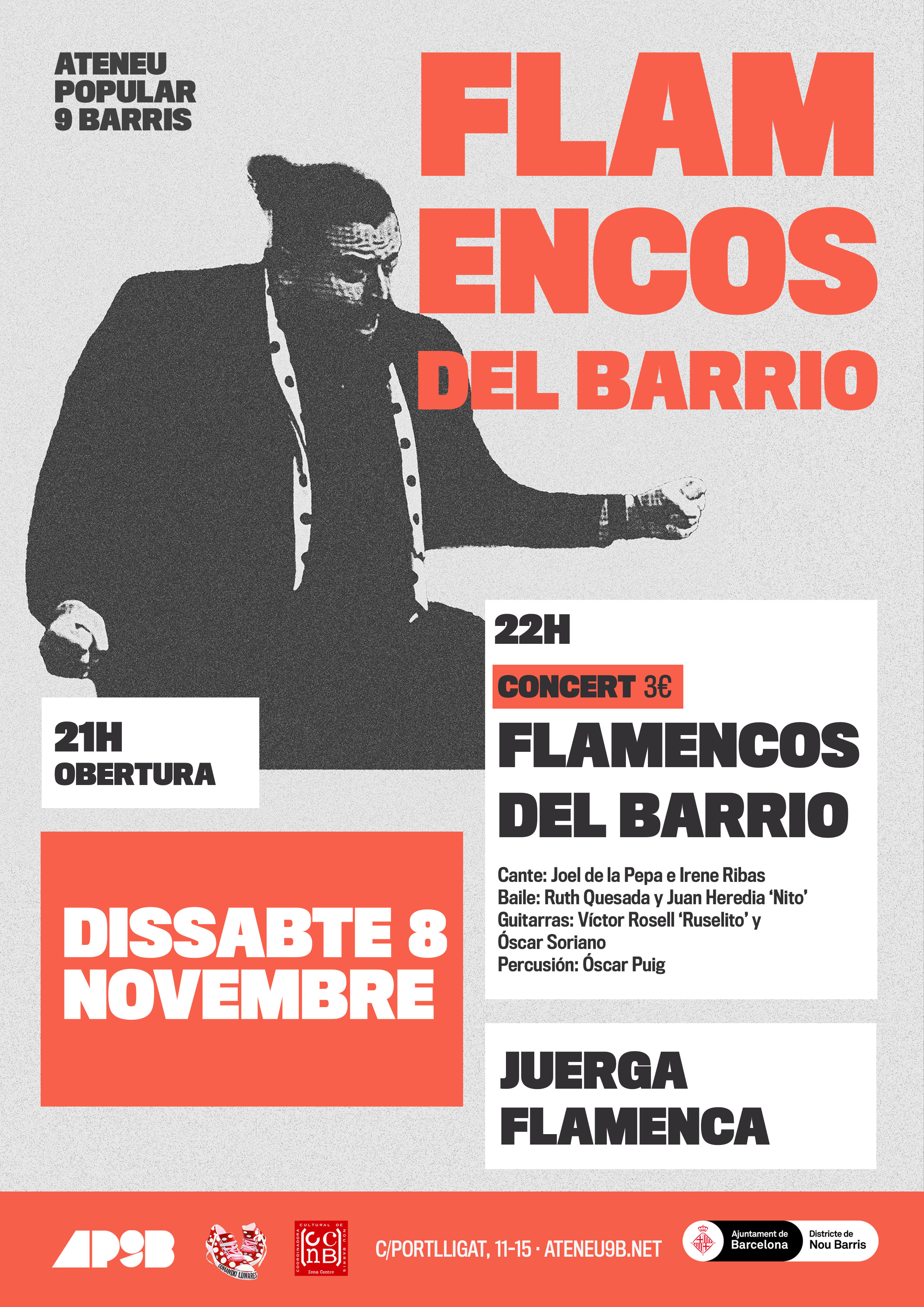 L’Ateneu Popular 9 Barris acull una nit especial per reivindicar i celebrar el flamenco. Flamencos del barrio és una trobada festiva que reuneix artistes locals i posa en valor el talent i la riquesa cultural de Nou Barris. Una ocasió única per gaudir de la música en directe i compartir l’alegria del flamenco.
