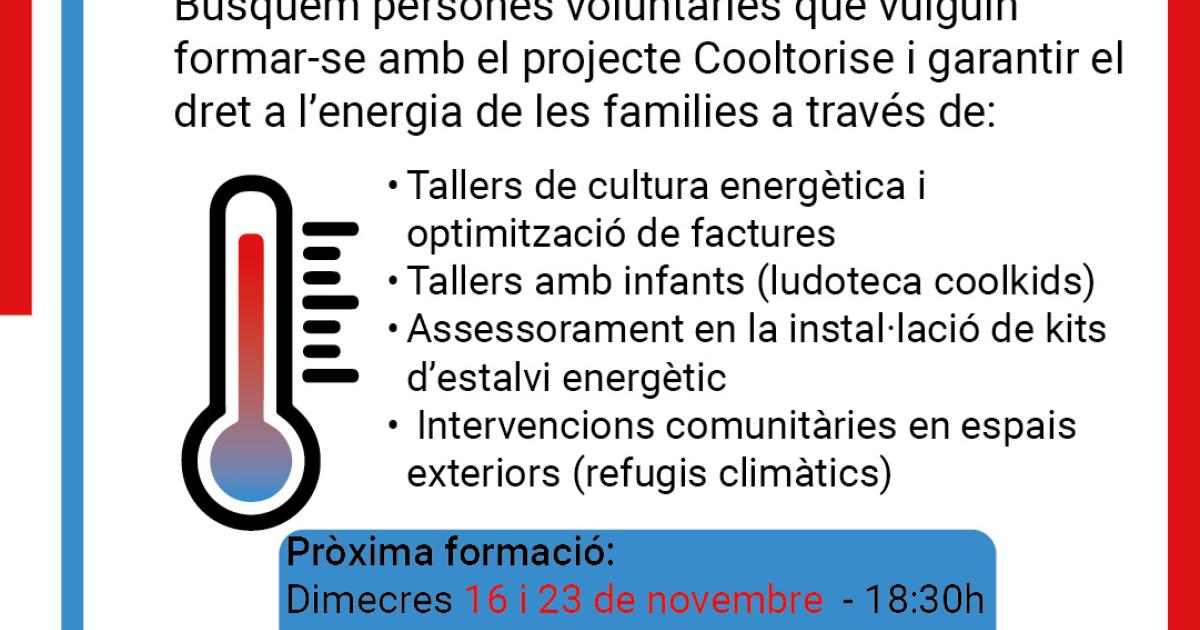 El projecte europeu COOLTORISE impulsa una nova edició de tallers per a persones voluntàries que vulguin formar-se com a agents de pobresa energètica i ajudar les famílies a ser més eficients i a estalviar energia.