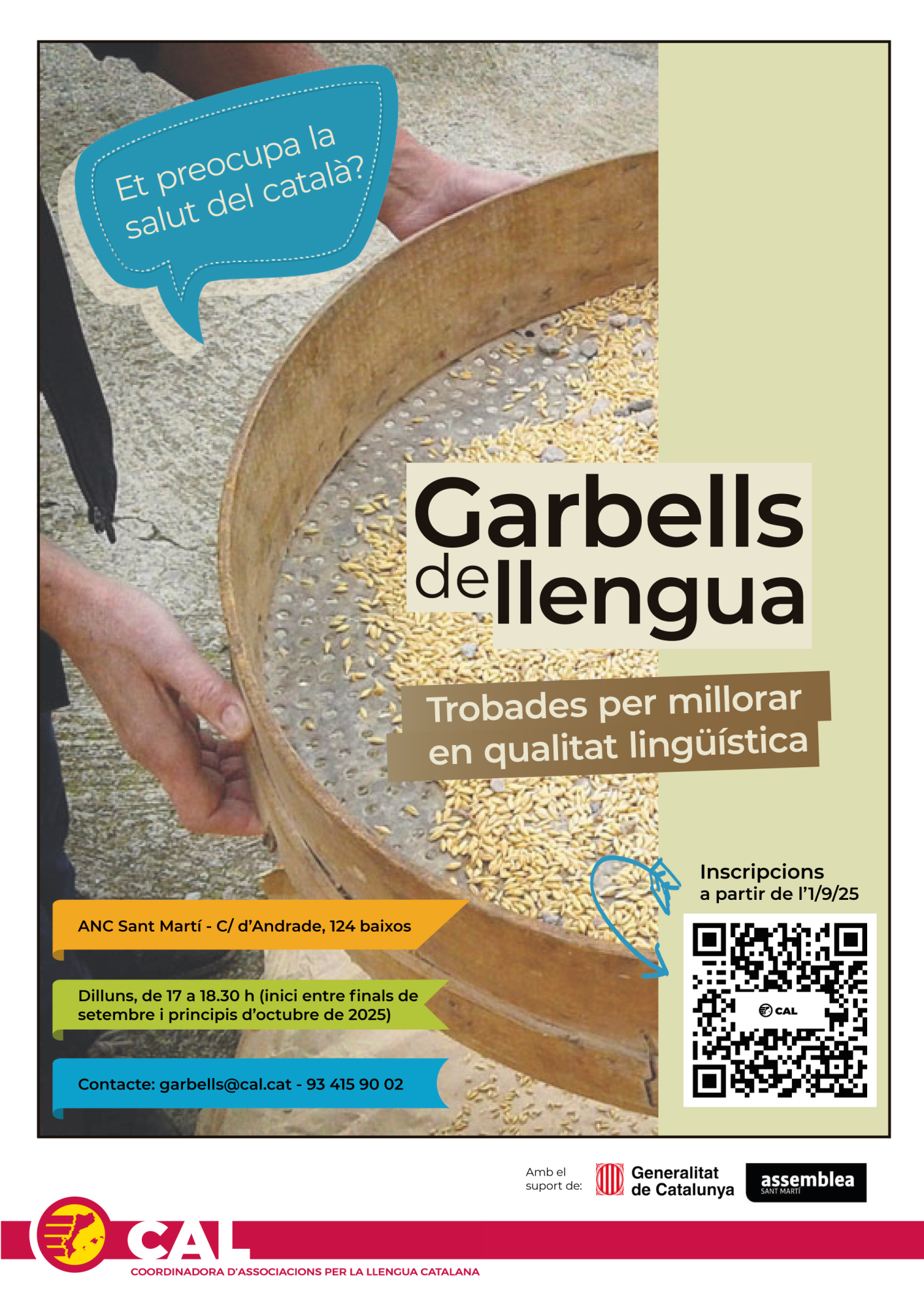 Es tracta d'un taller gratuït promogut per la Coordinadora d'Associacions per la Llengua Catalana (CAL). Trobaràs tota la informació a l'enllaç: https://www.cal.cat/projecte/garbells-de-llengua/