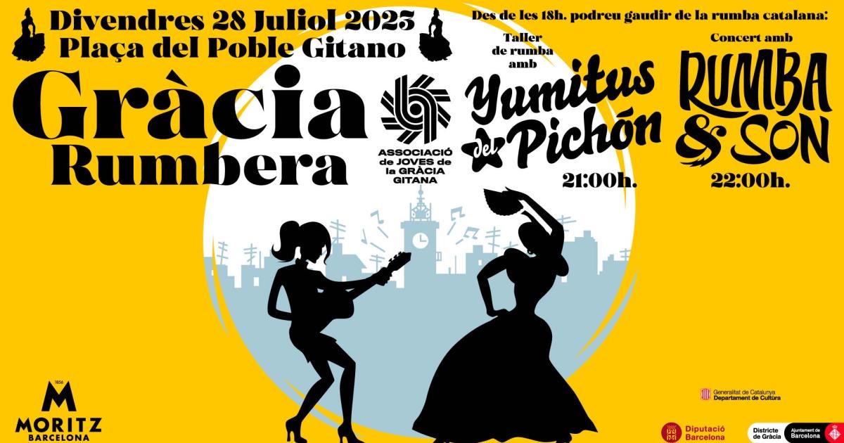 Data inici * dv., 28/07/2023 - 17:00 Districte i barri * Gràcia GRÀCIA RUMBERA Organitza joves de la gràcia gitana La rumba de gràcia desde les 17h fins les 00:00h Tallers i concert de rumba catalana