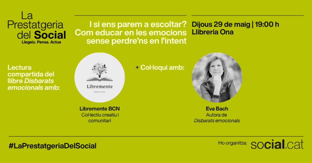 Ara que parlem de les nostres emocions més que mai, parem-nos a pensar: com ho estem fent? Quins són els nostres referents quan parlem d’educació emocional? Què és el que estem transmetent als infants i joves i de quina manera ho estem fent? Us convidem a fer-vos aquestes preguntes de manera col·lectiva en una trobada amb la pedagoga Eva Bach, autora de Disbarats emocionals. Ja n’hi ha prou, i amb qui podrem compartir dubtes, idees i neguits. Abans, es realitzarà una lectura compartida del llibre amb el col·lectiu Libremente BCN.