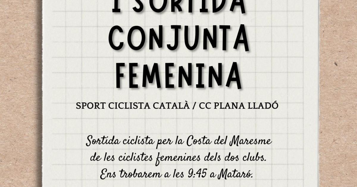 El CC Plana Lladó ens ha convidat a la I sortida conjunta femenina dels dos clubs el proper diumenge 29 de gener. En aquesta sortida les noies sereu les protagonistes, tant les que vinguin del CC Plana Lladó com les de l'Sport Ciclista Català. Serà una sortida fàcil per la Costa del Maresme (elles venen de Mollet) i quedarem a Mataró per fer els darrers Km junts abans d'esmorzar. Donarem un obsequi a les ciclistes assistents: Nosaltres regalarem un buff a les companyes del CC Plana Lladó i ells donaran alguna prenda del seu club.