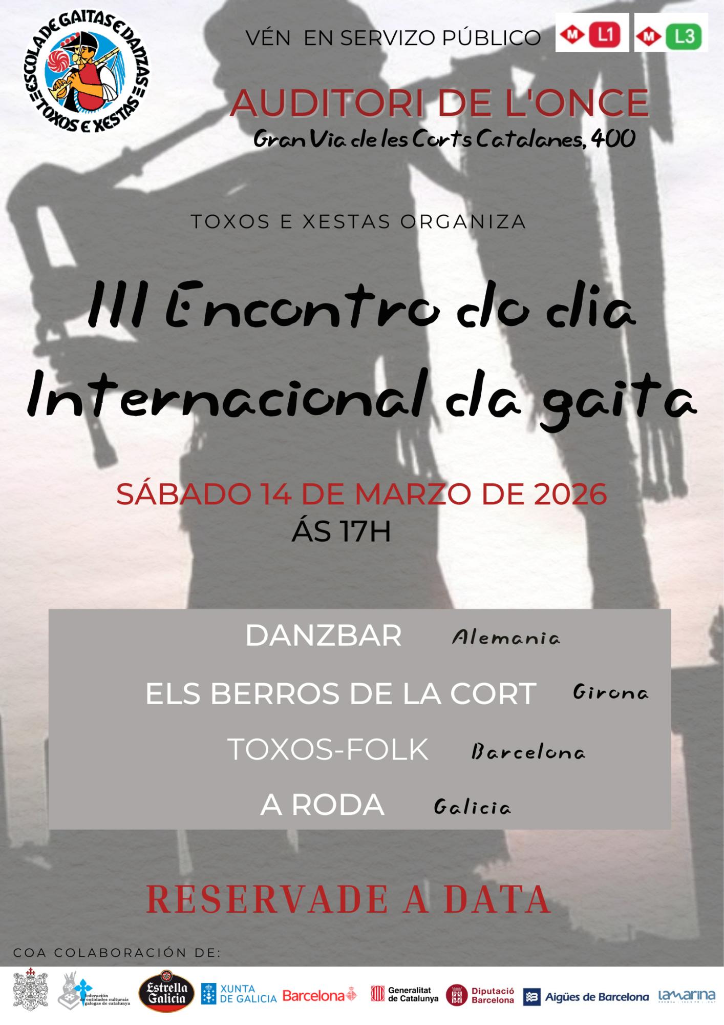 El dissabte 14 de març, a les 17.00 h, l’Auditori de l’ONCE (Gran Via de les Corts Catalanes, 400) seràl’escenari del III Encontro del Dia Internacional de la Gaita, una cita musical de referència que reuniràformacions de diferents punts d’Europa: Danzbar(Alemanya), Els Berros de la Cort (Girona), Toxos-Folk(Barcelona) i A Roda (Galícia).