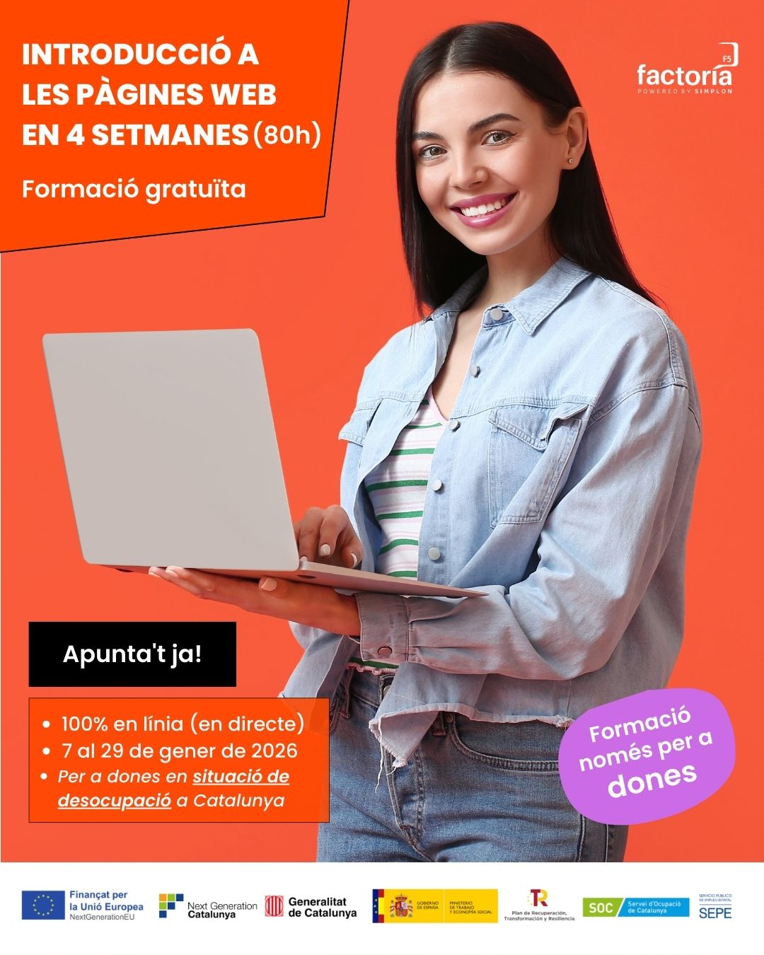 Si estàs en situació de desocupació, ets dona i vius a Catalunya, aquesta formació sense cost de 4 setmanes d'Introducció a les Pàgines Web és l'oportunitat per a tu.
