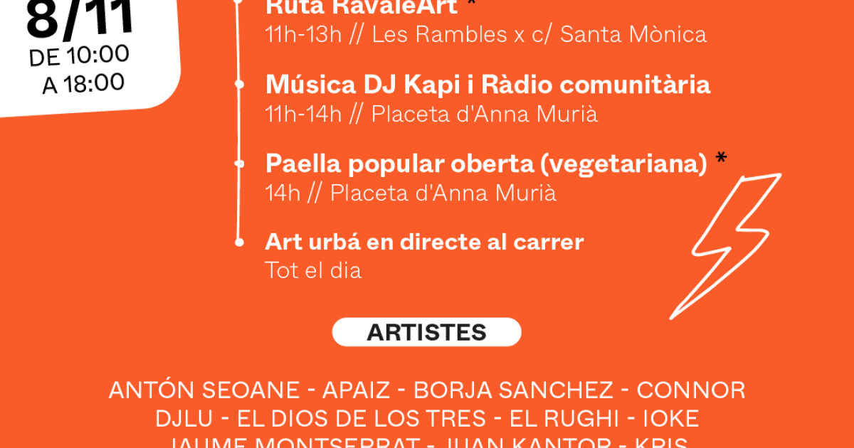 RavaleArt és comunitari i que millor que fer un àpat popular obert i de cohesió on participen les persones joves que s’han format per muntar esdeveniments comunitaris (cuina, muntatge, ràdio i preparació de les persianes). Una paella popular vegetariana per menjar tothom al carrer en l’espai de la Placeta d’Anna Murià i arc del teatre a partir de les 14 h. RESERVA EL TEU PLAT enviant la teva inscripció a través d’aquest formulari. (unitats limitades de plats de paella.)
