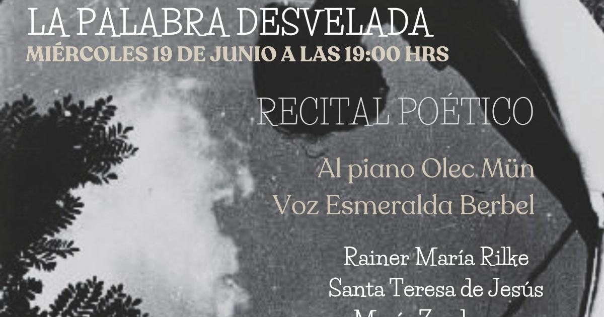 Recital poèticperformatiu a càrrec d'Olec Mün i Esmeralda Berbel. Berbel recitarà, acompanyada de Mün al piano, poemes de Rainer Maria Rilke, Maria Zambrano, Roberto Juarroz i Santa Teresa de Jesús, fent-nos conèixer aquests poetes i filòsofs místics.