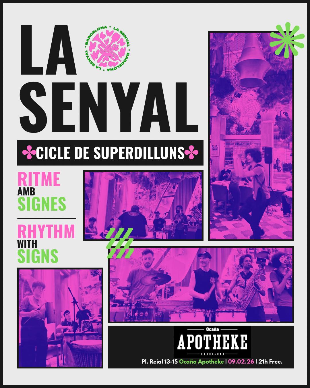 La Senyal: Rhythm & Signs — Dilluns 9 de febrer: Una estrena que cal veure per creure: música improvisada i basada en la percussió on el ritme es converteix en llenguatge. L’objectiu és crear una composició col·lectiva instantània d’alta qualitat, en què els músics interactuen en temps real. Una experiència hipnòtica i inesperada. Un espectacle únic al nostre Apotheke i amb entrada lliure!