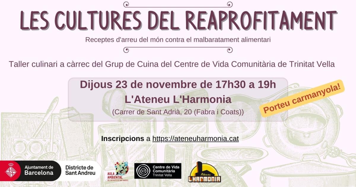 L'objectiu d'aquest taller és no llençar ni una mica de menjar. Per això, us animem a venir al taller culinari per aprendre receptes fàcils d'aprofitament alimentari d'arreu del món. Quins mètodes podem utilitzar? Com podem aprofitar el pa dur? Com conservem els aliments? Podem fer servir les pells per no llençar res? Quina és la clau per no malbaratar? Tot això i molt més en els tallers de reaprofitament d'aquesta tardor. Porteu carmanyola!
