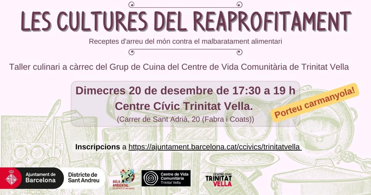 L'objectiu d'aquest taller és no llençar ni una mica de menjar. Per això, us animem a venir per aprendre receptes fàcils d'aprofitament alimentari d'arreu del món. Quins mètodes podem utilitzar? Quins són els plats més senzills per fer reaprofitament alimentari? Podem fer servir les pells per no llençar res? Quina és la clau per no malbaratar? Tot això i molt més en els tallers de reaprofitament d'aquesta tardor.