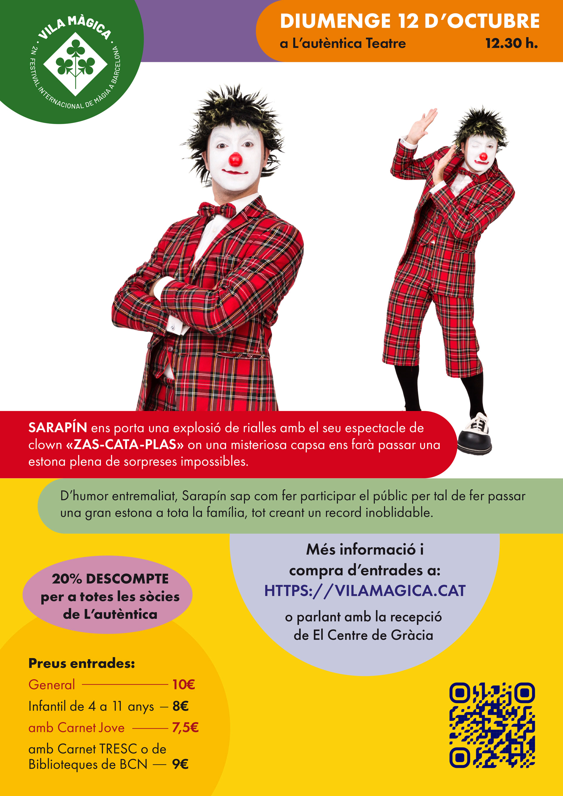 Prepara't per a una explosió de rialles, màgia i bogeries perquè l'inigualable pallasso Sarapín, ens porta a L'autèntica teatre, el seu espectacle estel·lar: «ZAS-CATA-PLAS»...