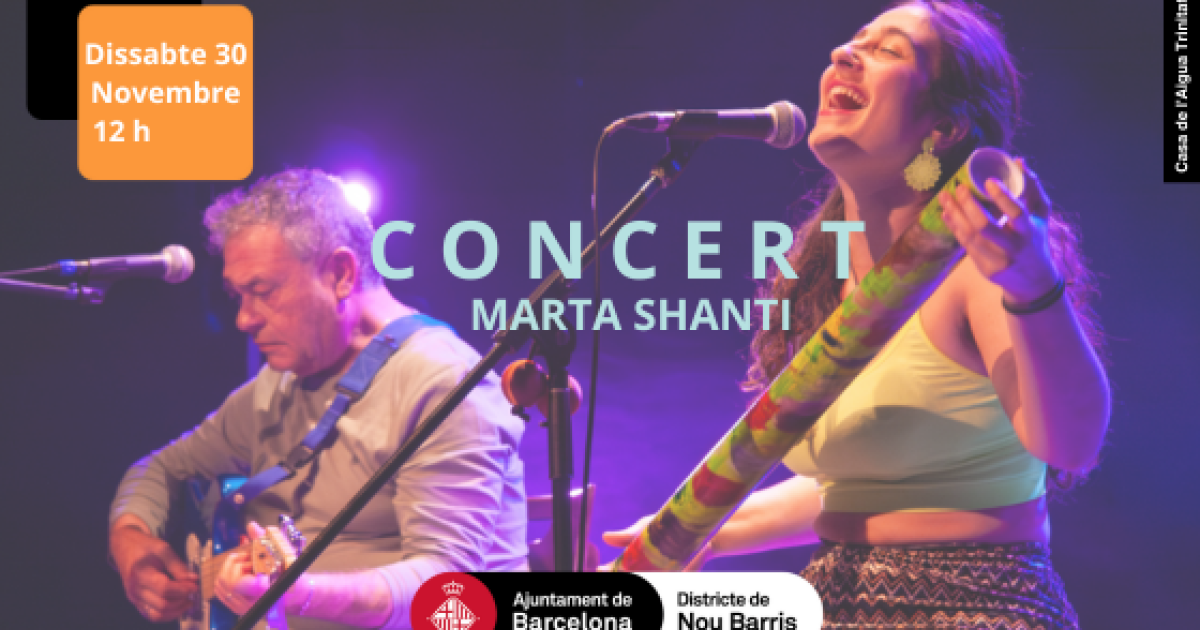 Data inici * ds., 30/11/2024 - 12:00 Districte i barri * Nou Barris Marta Shanti en concert Organitza Casa de l'Aigua de la Trinitat Nova Marta Shanti en concert La cantautora Marta Shanti ens farà passar una bona estona amb el seu recital de música melòdica amb acompanyament de guitarraNo us ho perdeu!!Acte gratuït i sense cita prèvia