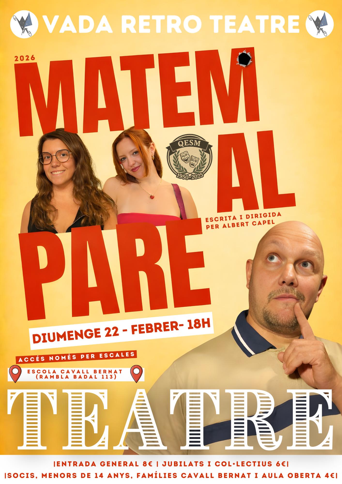 Data inici * dg., 22/02/2026 - 18:00 Districte i barri * Sants-MontjuïcLa Bordeta matem al pare Organitza Quadre Escènic Sant Medir (QESM) Si vols riure una bona estrona, vina a veure-la Dos filles d'una familia benestant, han de prendre decisions complicades.Es una comedia molt divertida, que no et pots perdre