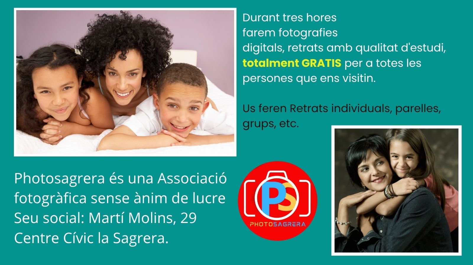 Durant tres hores farem fotografies digitals, retrats amb qualitat d'estudi, totalment GRATIS per a totes les persones que ens visitin.Us feren Retrats individuals, parelles, grups, etc.