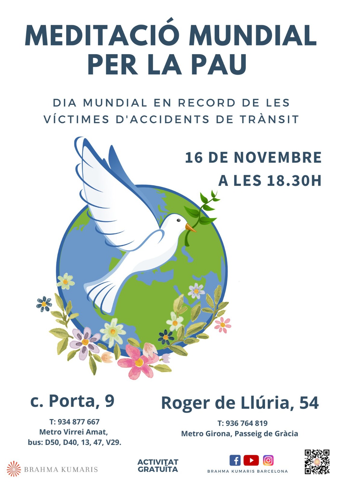Data inici * dg., 16/11/2025 - 18:30 Districte * Nou Barris Meditació Mundial per la Pau Organitza Associació Brahma Kumaris Reflexió i meditació per compartir vibracions de pau amb el Món. Compartir amb el Món les belles vibracions de la pau.