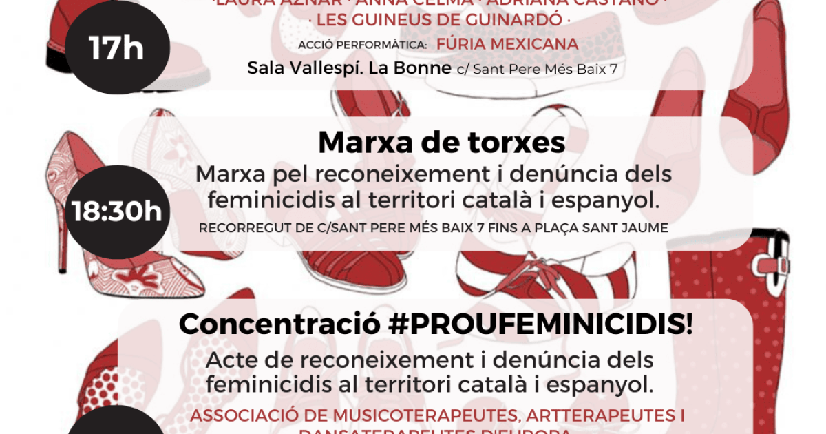 18.30h - Marxa cantada amb torxes pel reconeixement i denúncia dels feminicidis al territori català i espanyol, un recorregut des de c/Sant Pere Més Baix, 7 fins a la Pl. Sant Jaume (acompanyades per A.M.A.D (Associació de Musicoterapeutes Artterapeutes i Dansaterapeutes d’Europa) i el cor de dones).