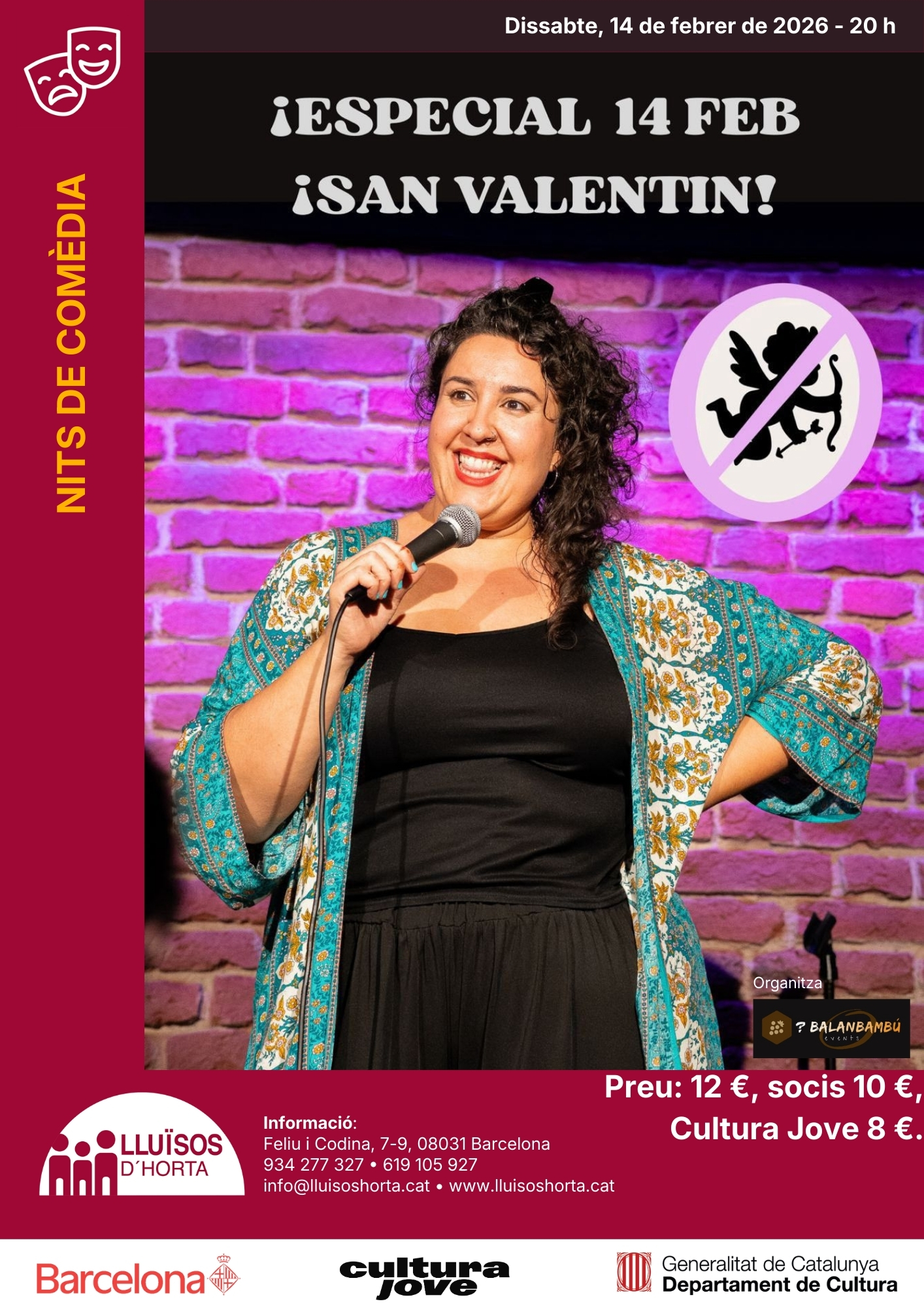 NITS DE COMÈDIA ens convida l’espectacle ESPECIAL 14 FEBRER, SANT VALENTÍ!, un monòleg d'Eva Cabezas. Aquest 14 de febrer, oblida't de cors, sopars romàntics i clixés. Vine a riure't de l'amor, del desamor, de les apps de Lliga, dels “crush”, els “ghostings” i de tots aquests mites moderns que ens han explicat sobre l'amor.
