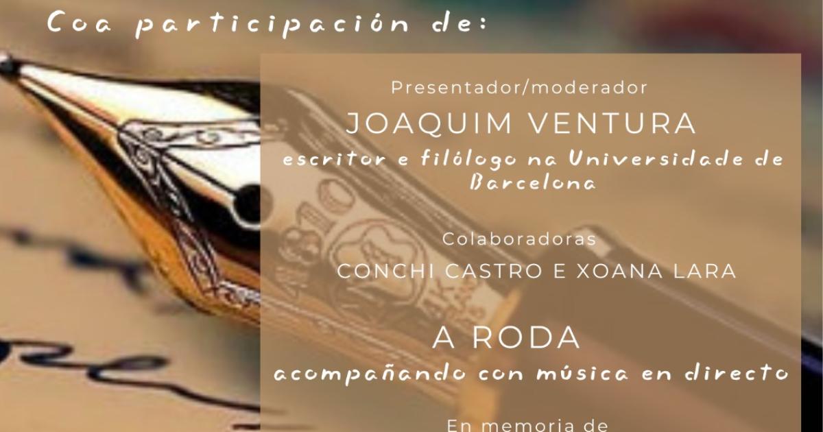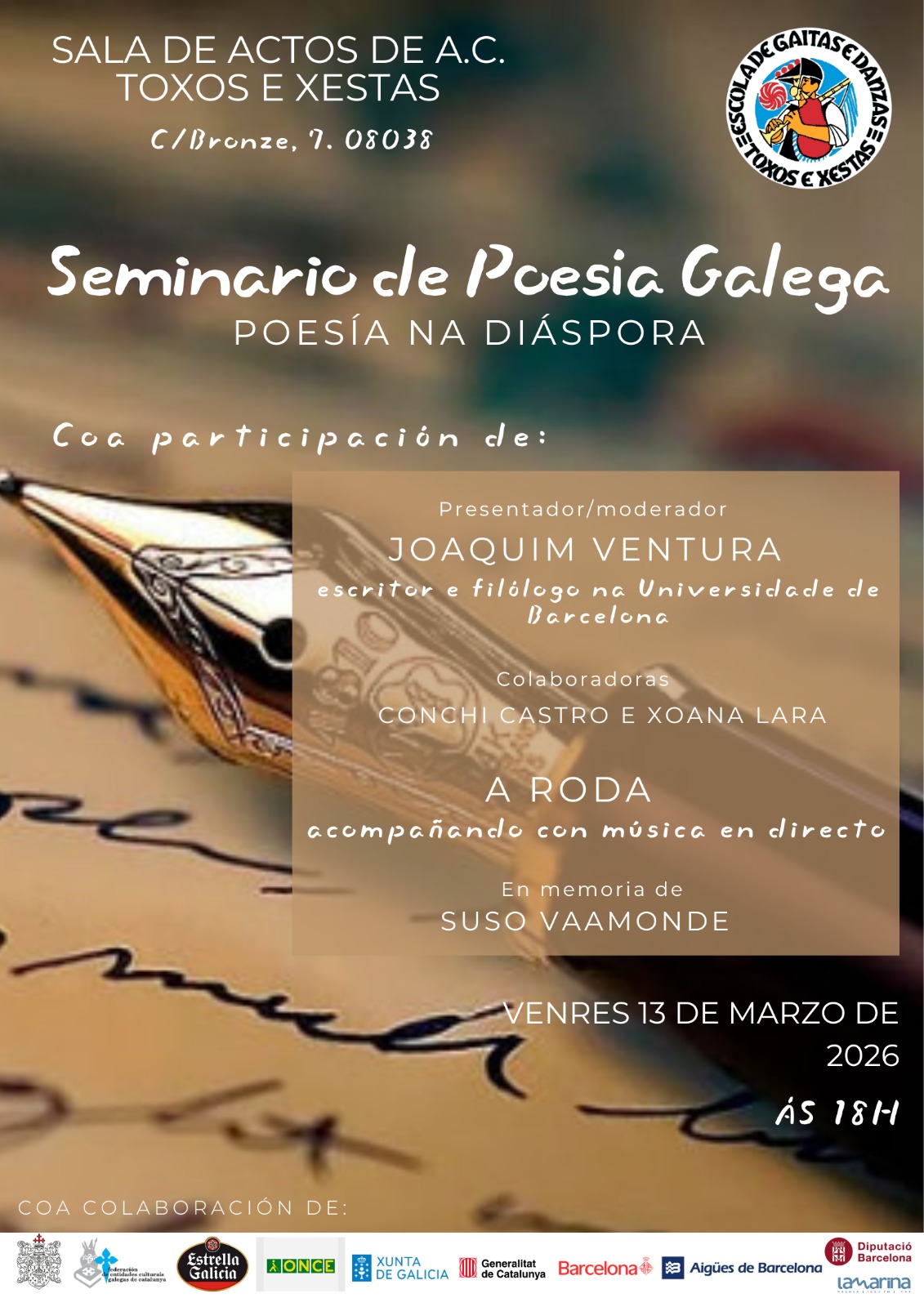 El divendres 13 de març, a les 18.00 h, la Sala d’Actesde l’A.C. Toxos e Xestas (carrer Bronze, 7 – Barcelona) acollirà el Seminari de Poesia Gallega “Poesia a la diàspora”, una trobada dedicada a la creació poèticagallega fora del seu territori d’origen. L’acte serà presentati moderat per l’escriptor i filòleg Joaquim Ventura(Universitat de Barcelona), amb la participació de Conchi Castro i Xoana Lara, i comptarà amb l’acompanyamentmusical en directe del grup A Roda, en homenatge a la memòria de Suso Vaamonde.